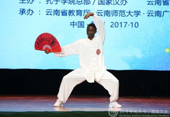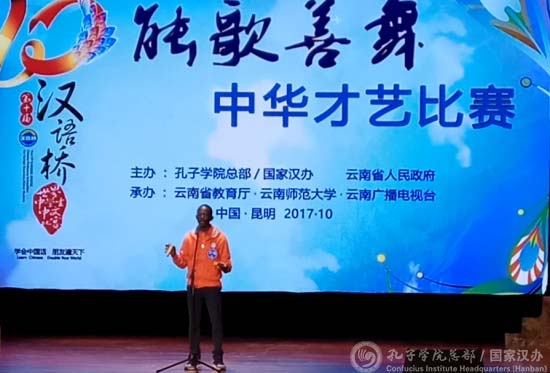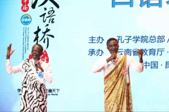 10月18日,在云南师范大学音乐舞蹈学院音乐厅里,来自誉有“千丘之国”美名的卢旺达的两名选手,身着独特的民族服装,在第十届“汉语桥”世界中学生中文比赛第二场“能说会道:口语比赛”赛场上闪亮登场。