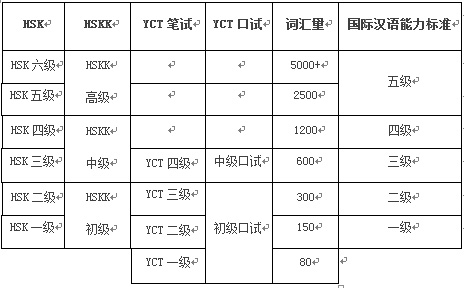 YCT各等级与《国际汉语能力标准》、HSK和HSKK的对应关系如下表所示: